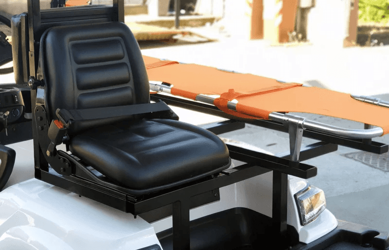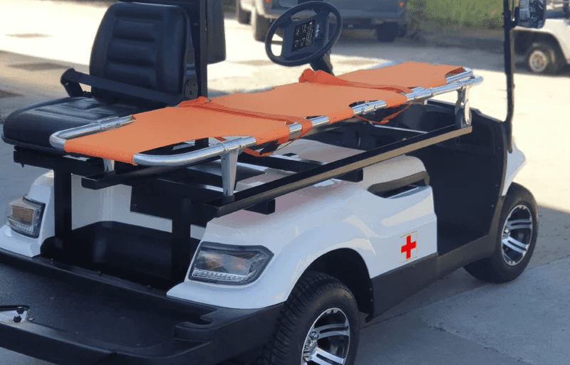 Veicolo elettrico allestito per il trasporto di persone infortunate con barella removibile e posto per il medico. Il veicolo è adatto per essere utilizzato, come primo soccorso, all’interno di impianti sportivi, grandi ospedali o centri turistici.