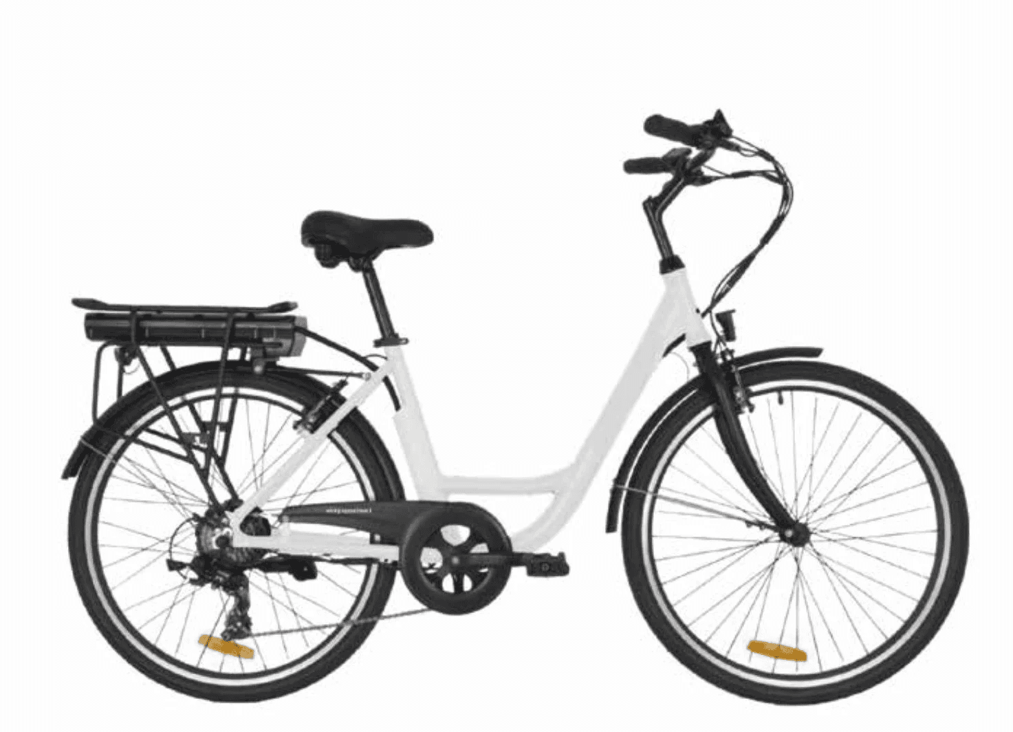 E‑bike elegante e funzionale: motore 250 W, autonomia fino a 40 km, batteria rimovibile, cambio Shimano e portapacchi integrato.
